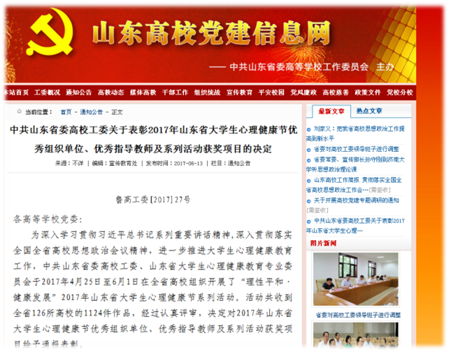 近日,山东省委高校工委下发《中共山东省委高校工委关于表彰2017年山东省大学生心理健康节优秀组织单位、优秀指导教师及系列活动获奖项目的决定》(鲁高工委〔2017〕27号),对2017年山东省大学生心理健康节优秀组织单位、优秀指导教师及系列活动获奖项目进行表彰。