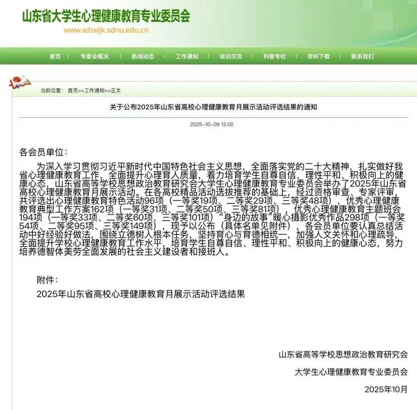 近日,2025年山东省高校心理健康教育月展示活动及山东省学生心理健康宣传教育月系列活动评选结果相继揭晓。我校师生凭借扎实的专业能力,在多项评选中斩获佳绩。