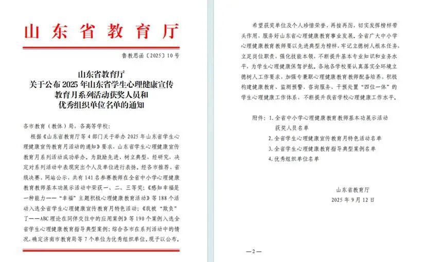 在2025年山东省学生心理健康宣传教育月系列活动中,我校捷报频传: