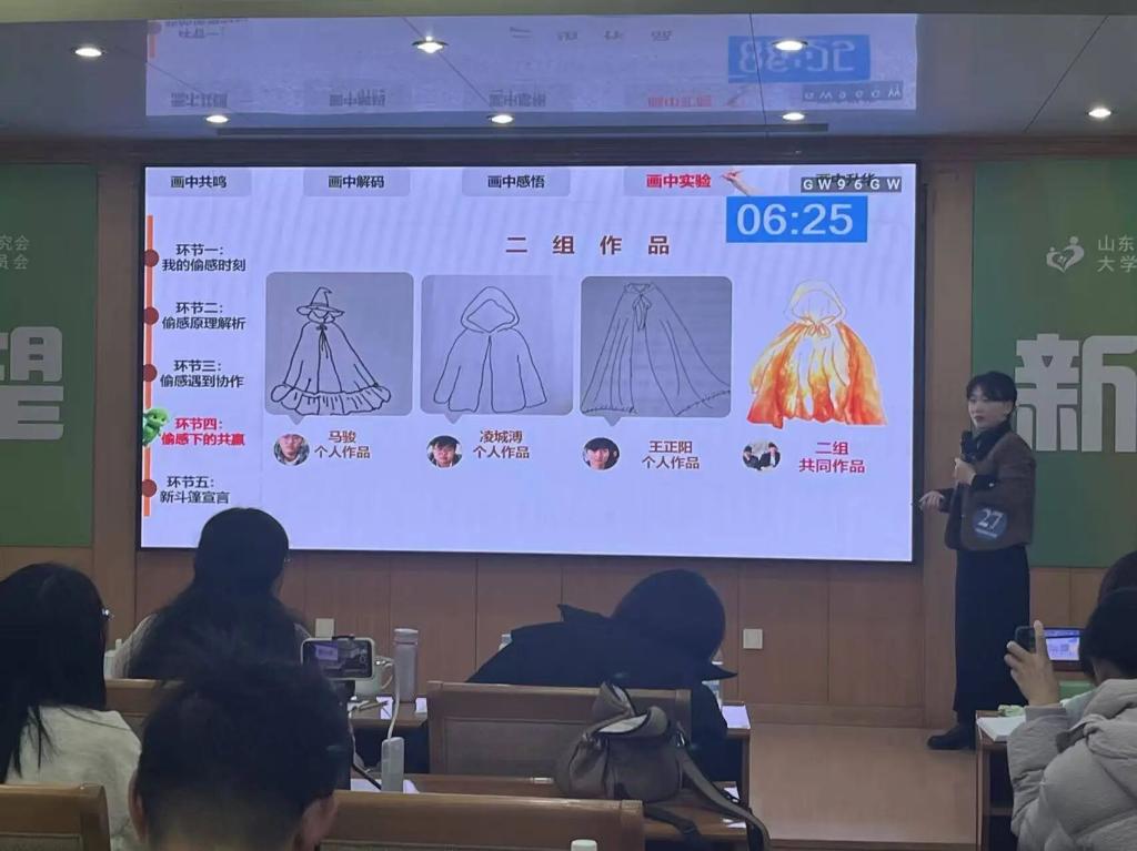 决赛中,张敏老师围绕当下年轻人中存在的“偷感”现象,以《我的隐形斗篷——与“偷感”共绘自我成长之路》为题,开展了一堂深入浅出、互动性强的心理体验课。从学生熟悉的“偷偷努力”“隐藏成长”等心理状态入手,通过“画中共鸣”“画中解码”“画中体验”等环节,引导学生认识“偷感”的成因与影响,理解其在自我保护与成长限制之间的双重作用,巧妙运用“隐形斗篷”这一生动比喻,借助绘画表达、情景讨论、AI辅助生成等方式,帮助学生看见自身“偷感”背后的心理动因,并鼓励学生在“偷偷精进”与“高效协作”之间找到平衡,最终通过“新斗篷宣言”环节,激励学生勇敢表达、积极分享,在集体中实现共同成长。