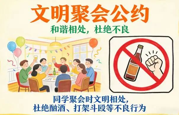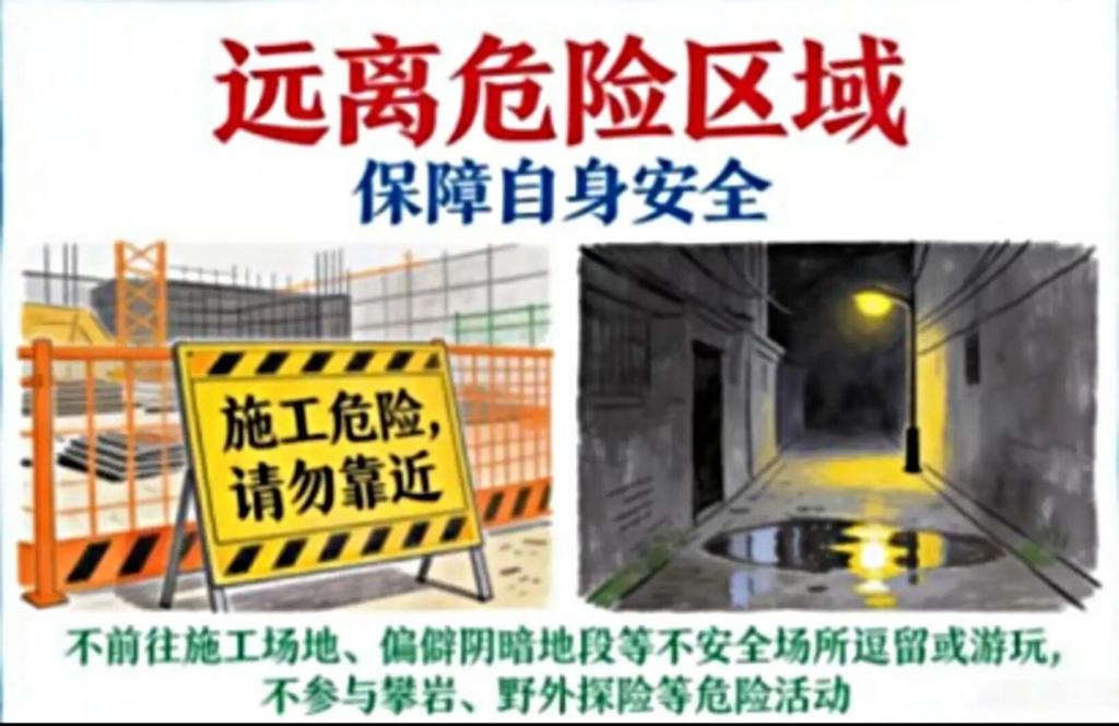 远离危险区域,不前往施工场地、偏僻阴暗地段等不安全场所逗留或游玩,不参与攀岩、野外探险等危险活动。女同学更要提高警惕,避免深夜或人员稀少时段单独外出,不滞留在外不归。同学聚会时文明相处,坚决杜绝酗酒、打架斗殴等不良行为,家长需提醒孩子适度社交、严守底线。