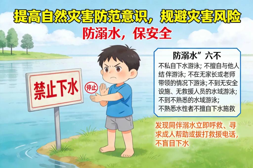 无论居家还是外出,都要提高自然灾害防范意识,规避各类灾害风险。严禁到河、湖、塘、堰等水域周边玩耍,更不得在结冰水面上溜冰、嬉戏,坚决做到防溺水“六不”:不私自下水游泳;不擅自与他人结伴游泳;不在无家长或老师带领的情况下游泳;不到无安全设施、无救援人员的水域游泳;不到不熟悉的水域游泳;不熟悉水性者不擅自下水施救。若发现同伴或他人溺水,应立即大声呼救,寻求成人帮助或拨打救援电话,切勿盲目下水。