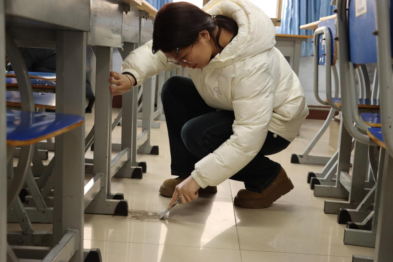 本次专项行动聚焦教室全域清洁,重点攻克平日里容易忽视的各类卫生死角,坚决做到不留盲区、不漏一处。针对课桌抽屉内的残留杂物、桌椅下方与墙角缝隙的积尘垃圾、讲台底部与储物柜内侧的隐蔽污渍、黑板槽及粉笔灰堆积处、门窗轨道与窗台死角、墙面蛛网及墙上、桌上的字迹等薄弱区域,要求各班全面排查、深度清理,彻底告别卫生盲区;同时同步做好桌面、座椅、门把手等高频接触部位的擦拭清洁,规整桌面文具、班级公物及卫生角物品,做到物品摆放有序、地面干净无垢、墙面整洁无污。