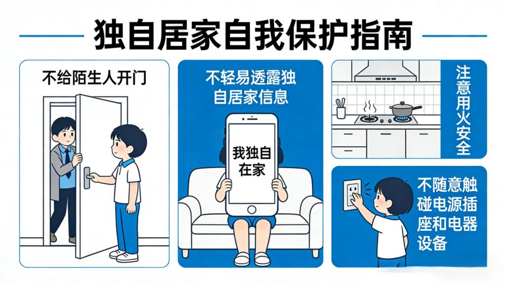 独自居家的同学,要提高自我保护意识,不给陌生人开门,不轻易透露独自居家的信息。注意用火、用电、用气安全,不玩火、不随意触碰电源插座和电器设备。