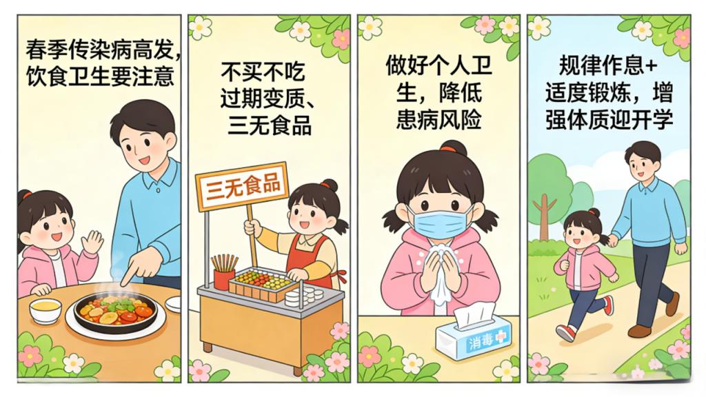 春季是流感、诺如病毒等传染病高发季节,家长要关注孩子的饮食卫生,引导孩子养成良好的饮食习惯。不吃生冷寒凉食物,不购买、不食用三无食品、过期变质食品,规律饮食、不暴饮暴食,做好个人卫生防护,降低患病风险。