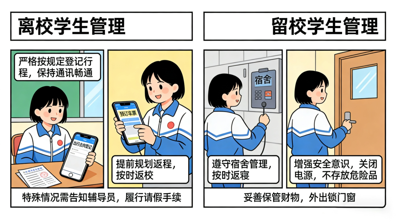 假期离校的同学,务必严格按照学校规定,及时做好个人出行去向登记,如实报备行程信息,全程保持手机通讯畅通,便于学校及时联络。请提前规划返程路线,尽早预订假期返校的车票,确保按时返校。如遇特殊情况无法按时返校,务必第一时间告知辅导员,严格履行请假审批手续,严禁无故逾期返校、擅自缺勤。