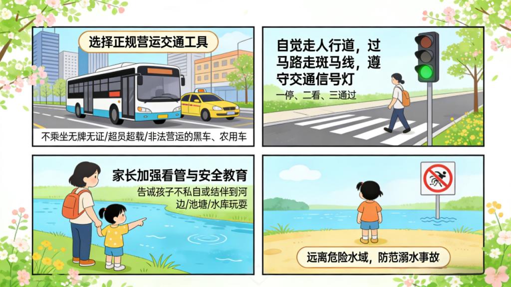 外出踏青、返乡时,要选择正规营运的交通工具,坚决不乘坐无牌无证、超员超载、非法营运的黑车、农用车等隐患车辆。步行外出时,自觉走人行道,过马路走斑马线,严格遵守交通信号灯指示,牢记“一停、二看、三通过”,不横穿马路、不翻越护栏,杜绝交通意外。