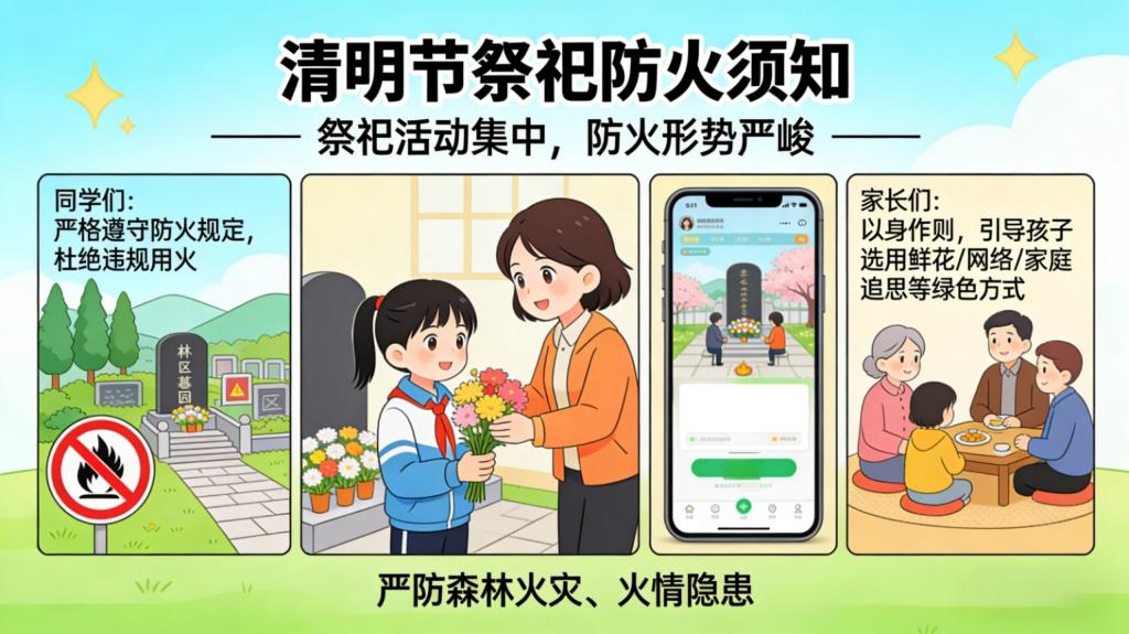 清明节期间祭祀活动集中,林区、墓园、景区防火形势严峻。同学们参与祭扫时,务必严格遵守各祭扫场所的防火规定,坚决杜绝违规用火行为。家长们要以身作则,引导孩子选用鲜花祭扫、网络祭扫、家庭追思等绿色、环保、文明的方式寄托哀思,严防引发森林火灾、火情隐患等安全事故。