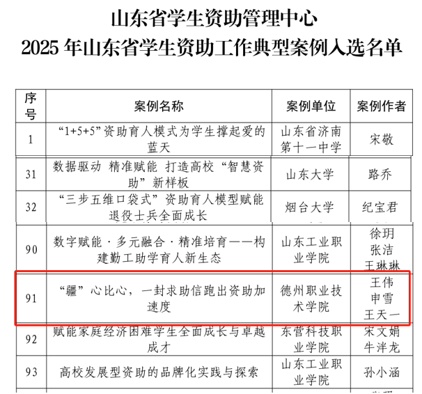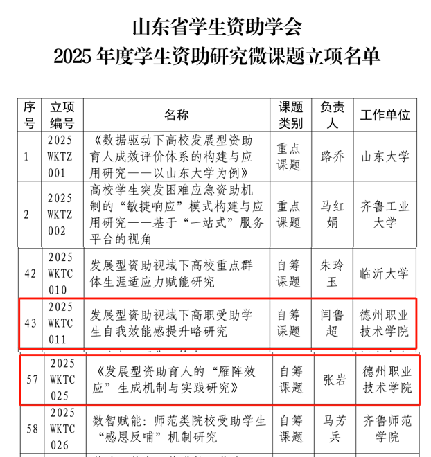 理论研究同样亮点纷呈。近日,山东省学生资助管理中心、山东省学生资助学会公布2025年度资助工作典型案例和微课题立项名单,我校案例《“疆”心比心,一封求助信跑出资助加速度》成功入选全省资助工作典型案例,提交的两项课题均获批省级立项。案例生动呈现了学校在精准帮扶、快速响应、人文关怀等方面的扎实工作;课题则聚焦“发展型资助”,从“自我效能感提升”和“雁阵效应”两个维度探索受助学生成长新路径。