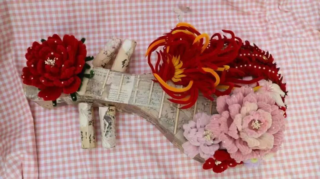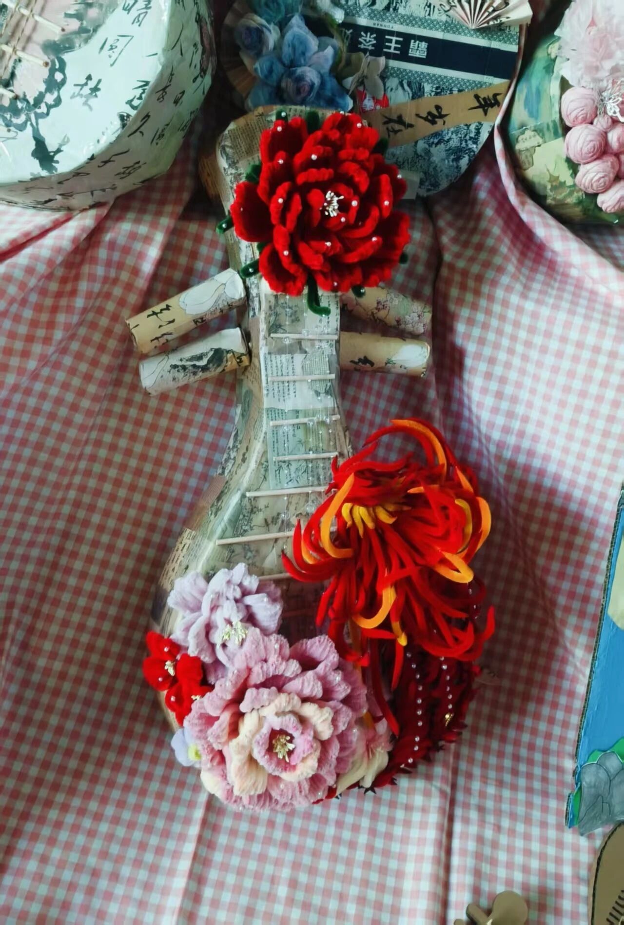 琵琶造型的变废为宝作品,以废旧材料为基,经创意雕琢。报纸纹理似岁月脉络,手工花朵如心灵绽放的绮梦。它们是对传统的致敬,更是心灵与艺术的交融,提醒我们在喧嚣中重拾宁静,于平凡里挖掘美好,让心灵在旧物焕新中寻得归所。