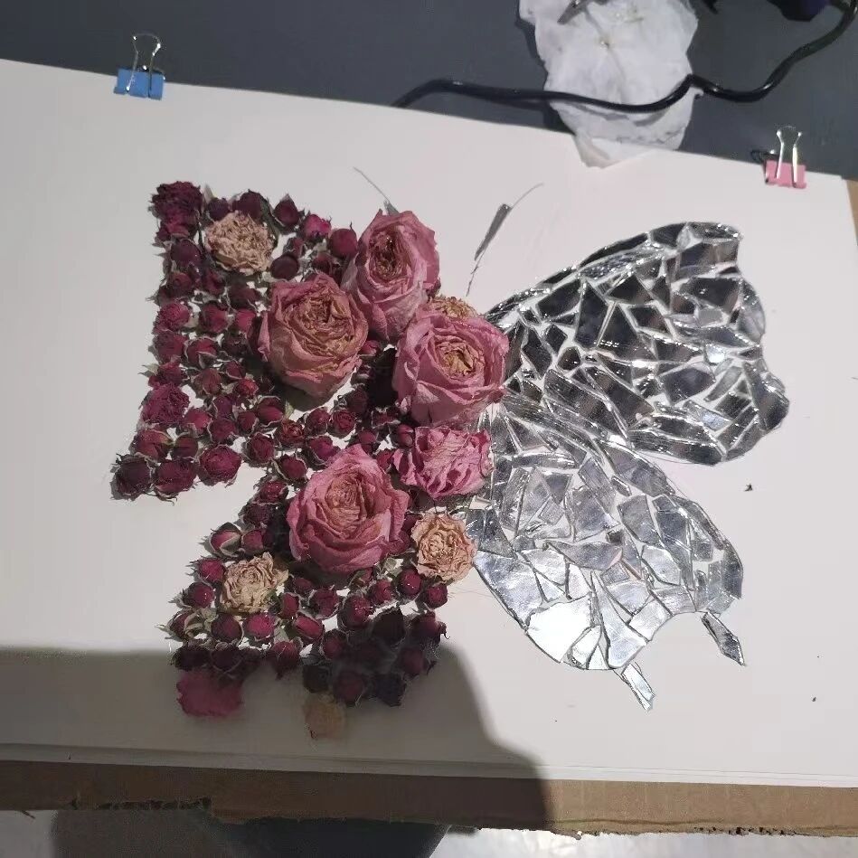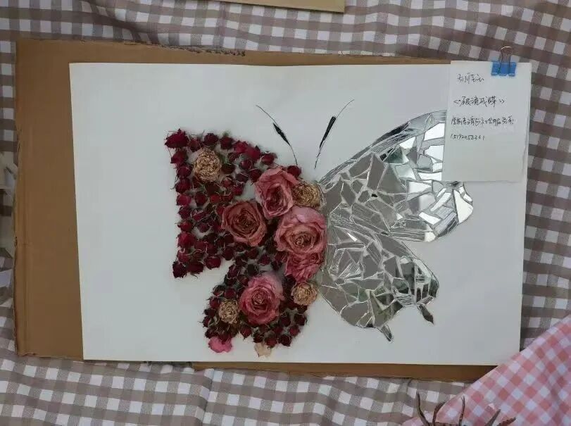 这幅变废为宝之作,以枯萎玫瑰与废弃锡纸勾勒蝴蝶之姿。凋零花朵重寻生机,残破锡纸再绽华彩。它似心灵写照,于困境中蜕变,于荒芜处生花,提醒我们即便身处平凡琐碎,也能借创意与巧思,让心灵如蝶,挣脱束缚,飞向美好新境。