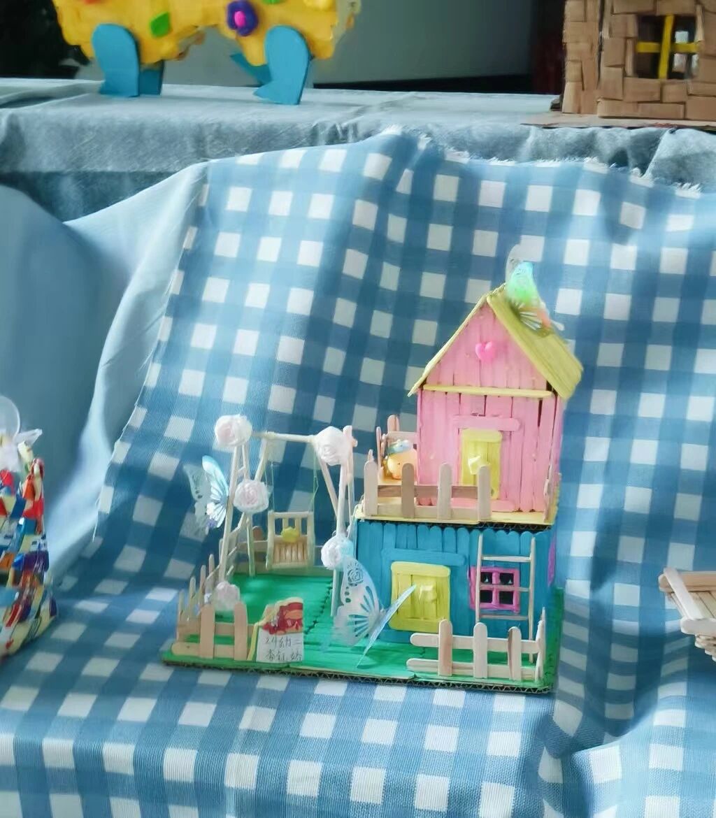 此变废为宝之作,以雪糕棍搭建小屋,纸巾花装点庭院,蝴蝶翩跹其间。看似平凡的废弃物,经匠心组合,化为梦幻家园。它宛如心灵缩影,承载着对宁静美好的向往,提醒人们在纷扰尘世中,可借创意与巧思,为心灵觅一方诗意净土。